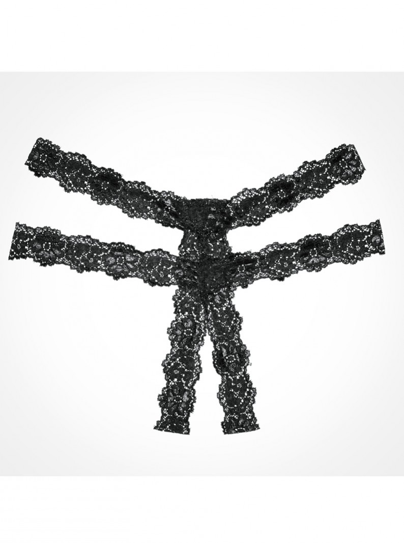 Stretch lace strappy thong panty with open crotch. Other accessories not included.