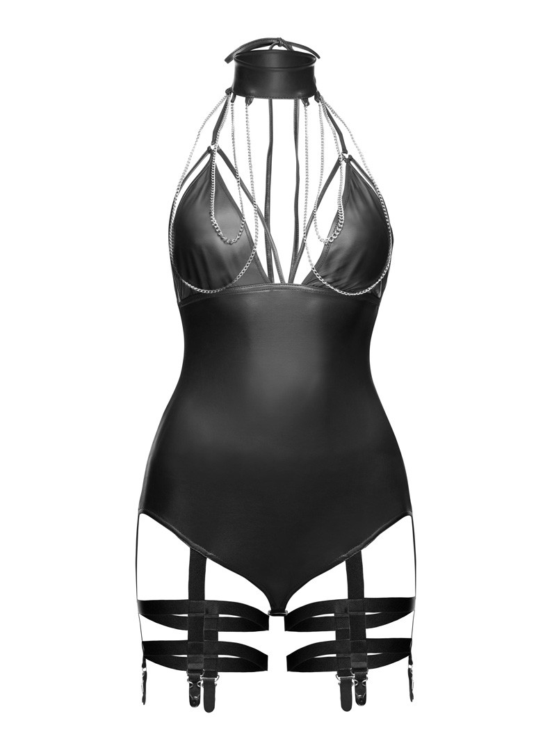 Wet-loon bodysuit with choker style neckline, draped chains, strappy V-neck, attached garter straps with strappy leg garters, and zipper closure. Fetish-inspired. Imported from Europe. Other accessories not included. Please allow 1-2 weeks for delivery.