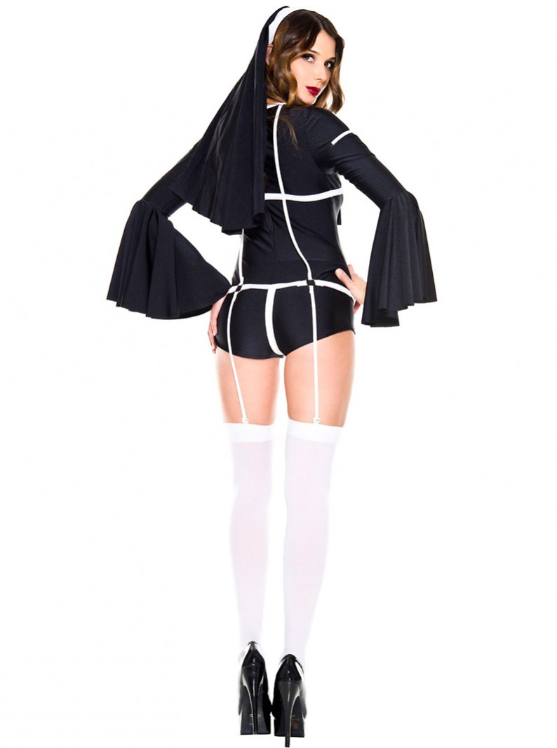 Four-piece nun costume. Includes a strappy romper with flare sleeves, habit, cross, and thigh highs. Other accessories not included.