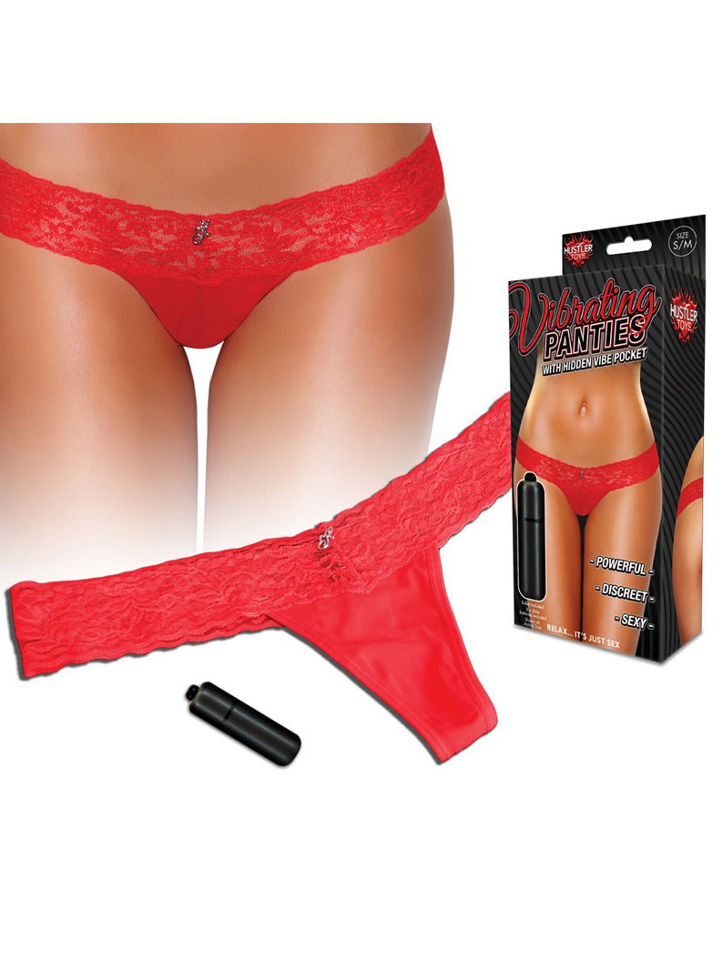 Vibrating lace panty from Hustler! Features a hidden vibe and a powerful bullet. Requires 3x LR44 batteries, included.