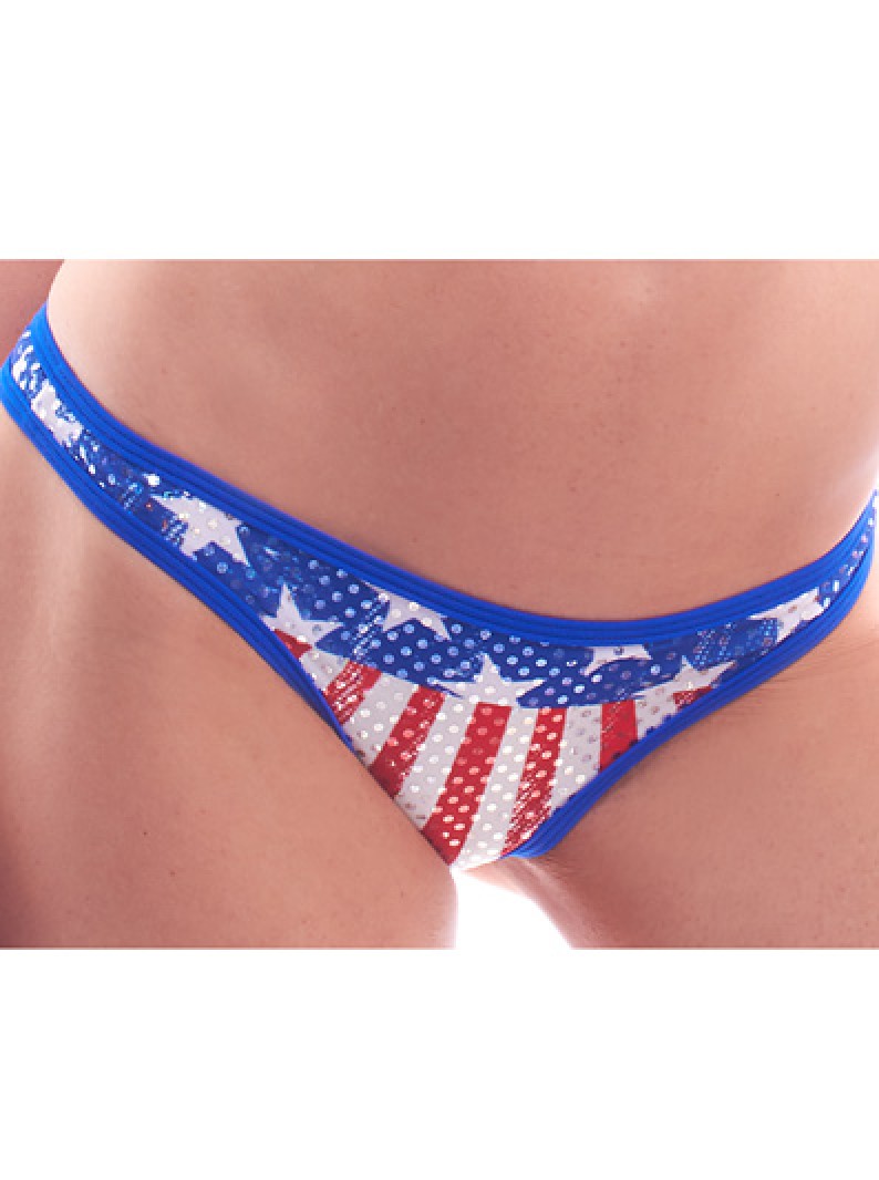 USA flag inspired perfect thong bikini bottom with hologram details and stars and stripes print. Patriotic American flag. Top not included. Other accessories not included.