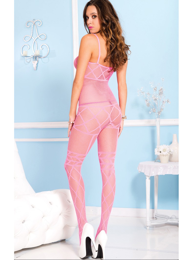 Pink fishnet bodystocking with criss-cross details, open crotch, and spaghetti tank straps. (Model is wearing a panty- not included.) Other accessories not included.