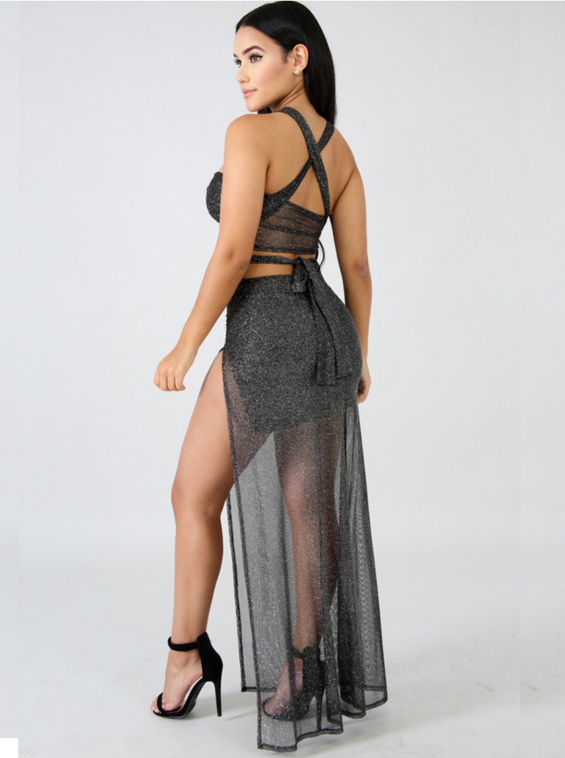 Sparkle Sheer Wrap Around Top & Long Skirt W/ Slit Set