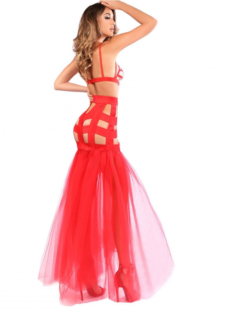 Two-piece gown set. Includes a super strappy mermaid style gown and matching lace g-string. Gown features strappy triangle cups, high-waisted style skirt, and sheer tulle tail. Fetish-inspired. Other accessories not included.