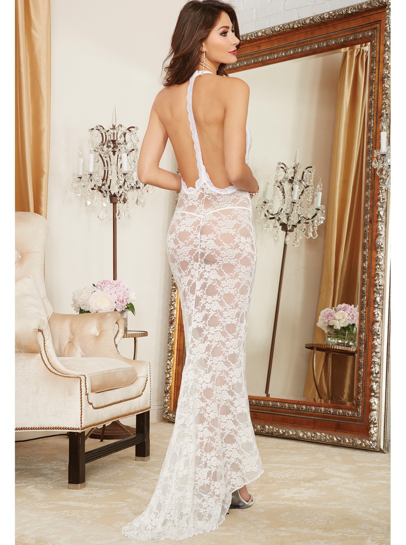 Stretch Lace Lingerie Gown w/ Train & G-String Panty