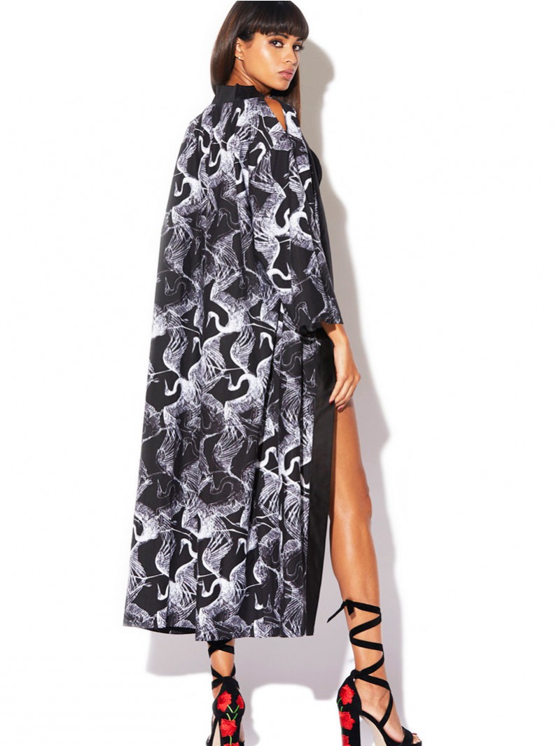Kimono style long robe with long sleeves, white cranes print, and cold shoulder slits. Model is wearing a bodysuit- not included. Other accessories not included.